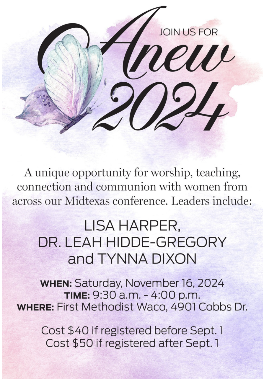 The Anew 2024 Women’s Ministry event will include time for worship and connecting with women from your local church and across the conference. There will be teaching and preaching from nationally-known speaker and author Lisa Harper, Dr. Leah Hidde-Gregory, and Rev. Tynna Dixon, the first Elder ordained in our new Global Methodist Church.